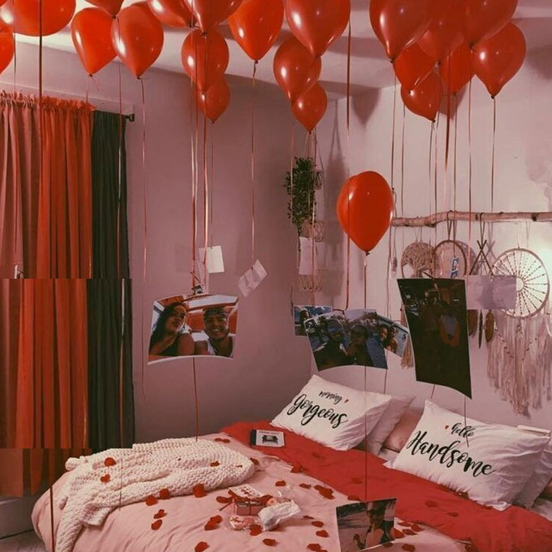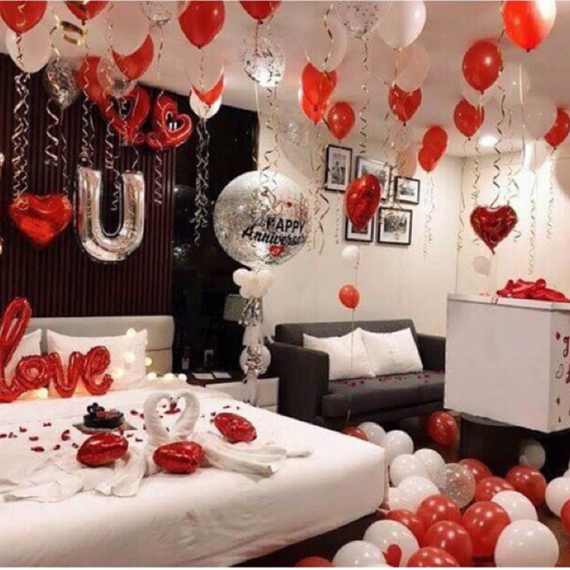 Create a mesmerizing atmosphere for your anniversary with enchanting room decorations! Transform your space into a romantic haven using a palette of soft hues and delicate accents. Adorn the walls with fairy lights, casting a warm, intimate glow. Arrange an array of heart-shaped balloons in elegant clusters, floating gracefully above a bed adorned with silky sheets and fragrant flowers. Scatter personalized photo frames around, capturing cherished moments. Hang a banner declaring your love, and let 100 balloons cascade from the ceiling, symbolizing the joyous journey of your union. This heartfelt decor will evoke emotions, creating a timeless celebration that reflects the love shared over a beautiful year.
